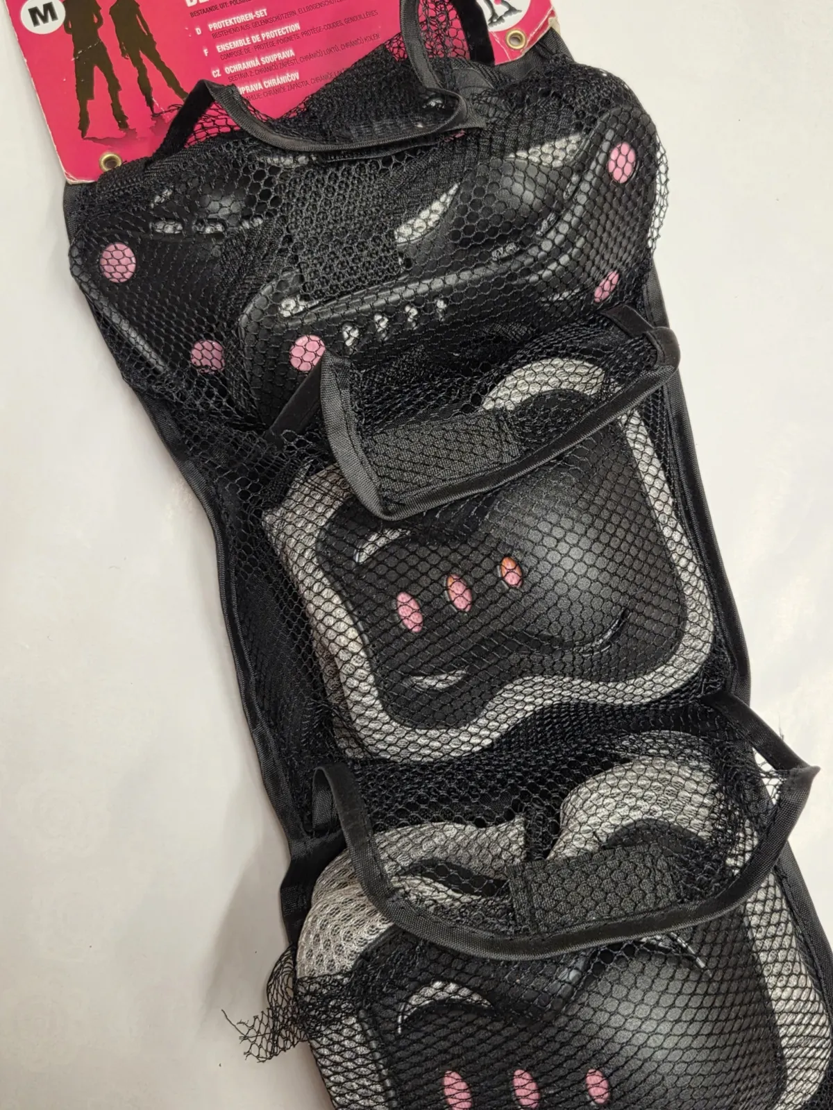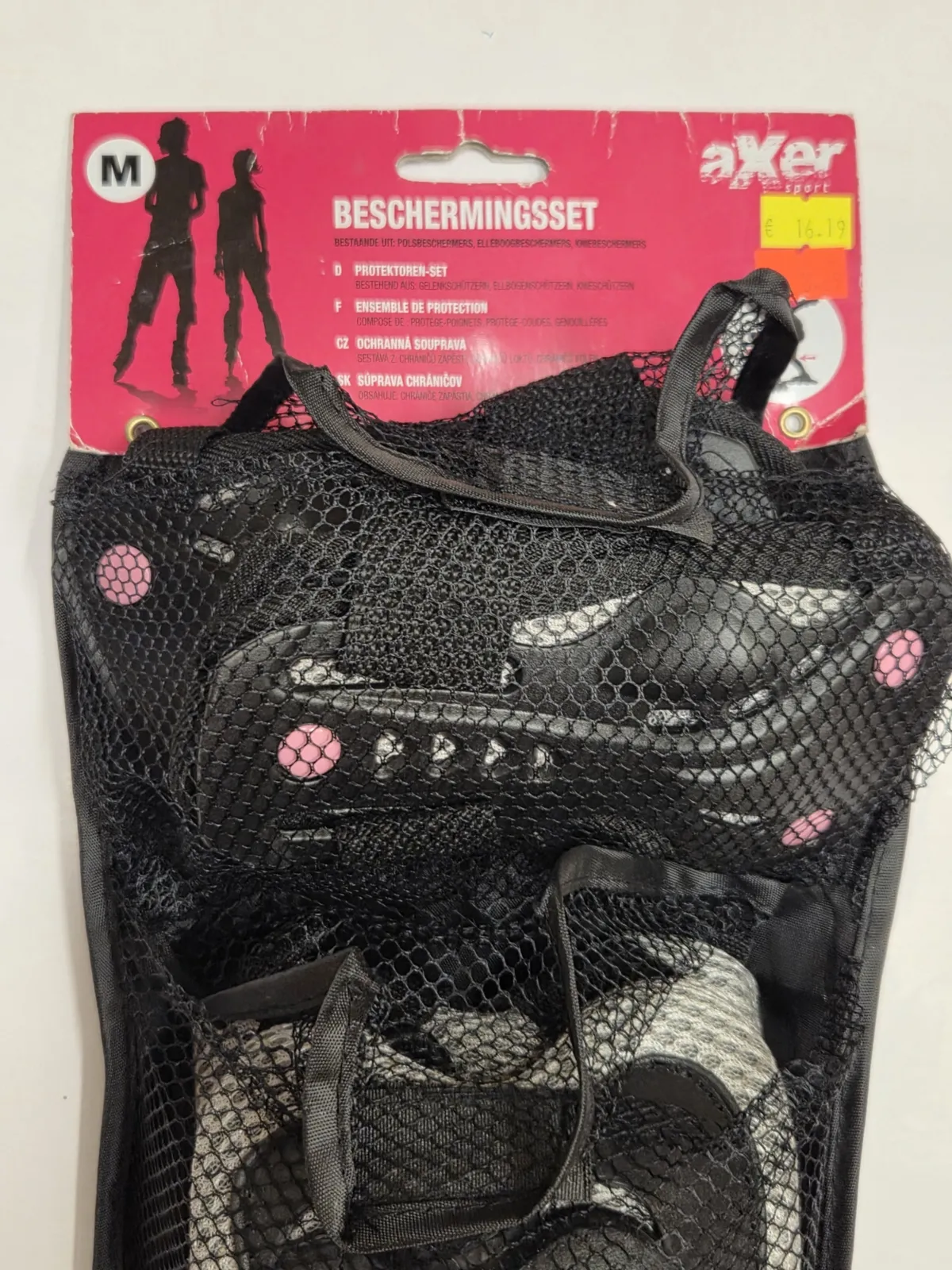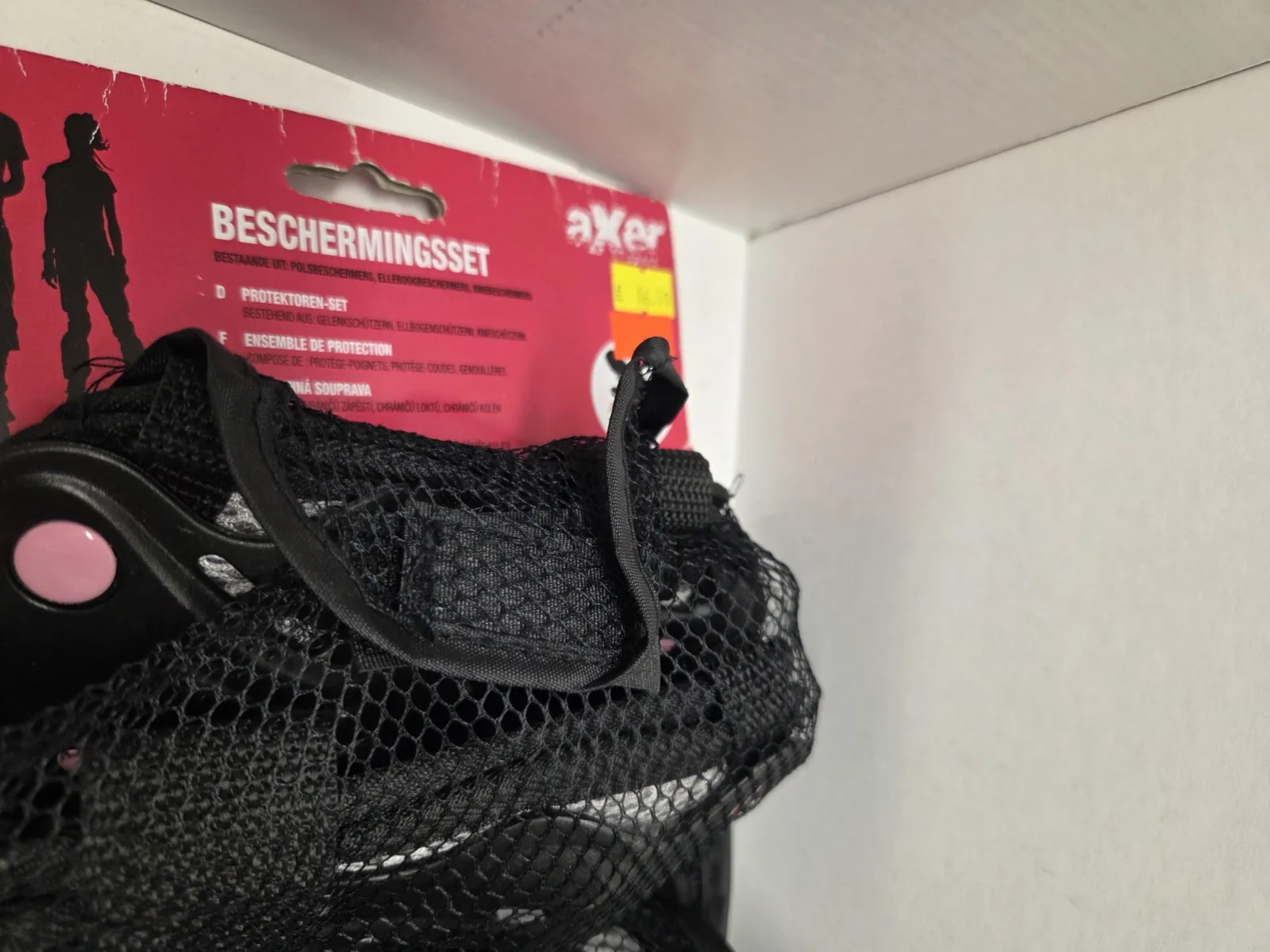 Apsaugos įdėtos į tinklinį saugojimo maišiuką, kuris vietomis yra pažeistas.