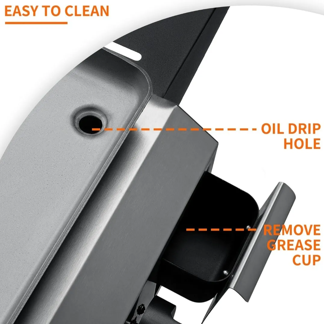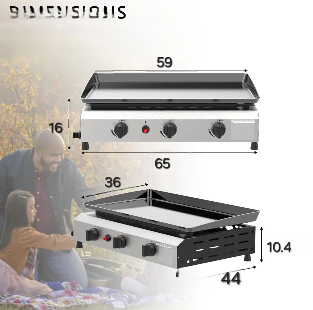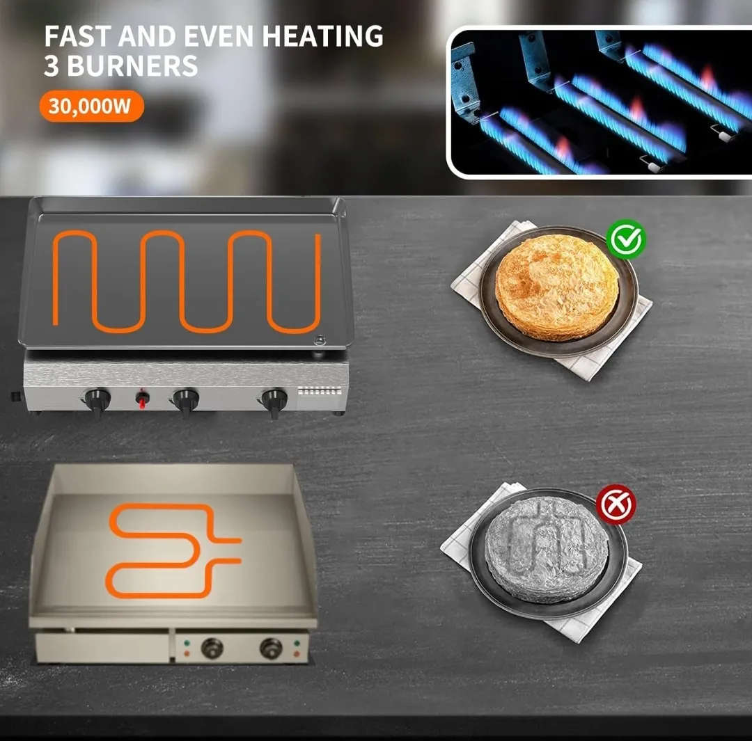 3 nepriklausomai valdomi nerūdijančio plieno vamzdiniai degikliai, kurių galia yra 10 000 BTU, iš viso sukuria 30 000 BTU, reguliuojamą nuo mažos iki didelės galios