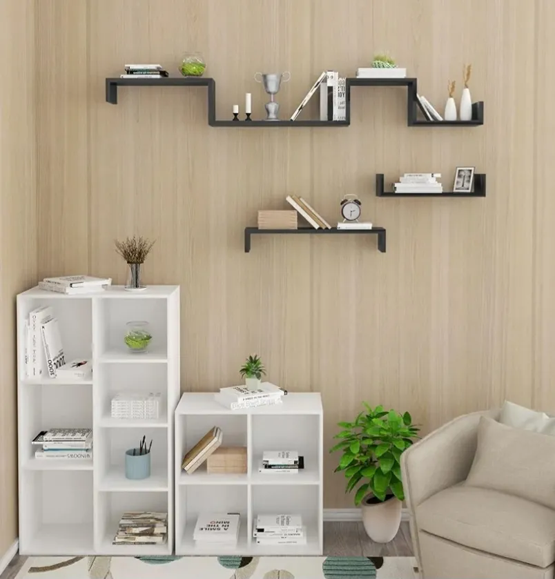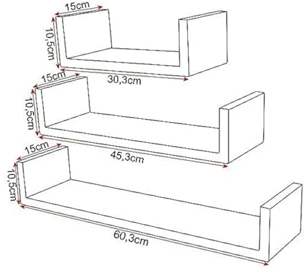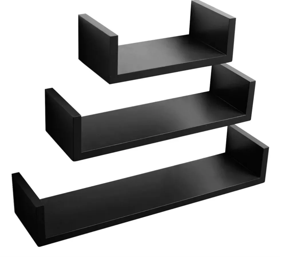 3 plaukiojančių lentynų rinkinys, U formos, paslėpta sieninė lentyna, medinė, plaukiojanti lentyna, 60 cm / 45 cm / 30 cm ilgio, juoda