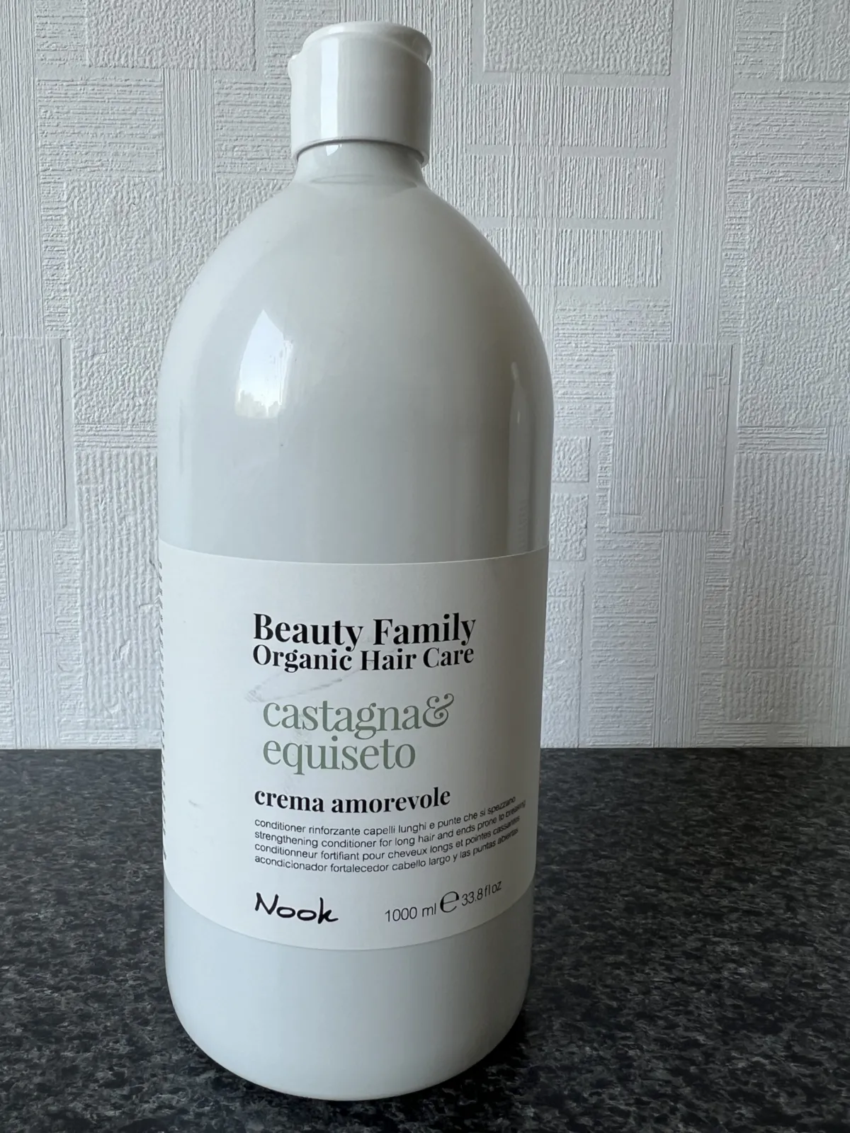 „Nook Beauty Family Organic Hair Care“ stiprinamasis kondicionierius ilgiems, lūžinėjantiems plaukams, pasižymintis lengva ir kremine tekstūra, drėkina, maitina ir suteikia blizgesio lūžinėjantiems ir sausiems plaukams.