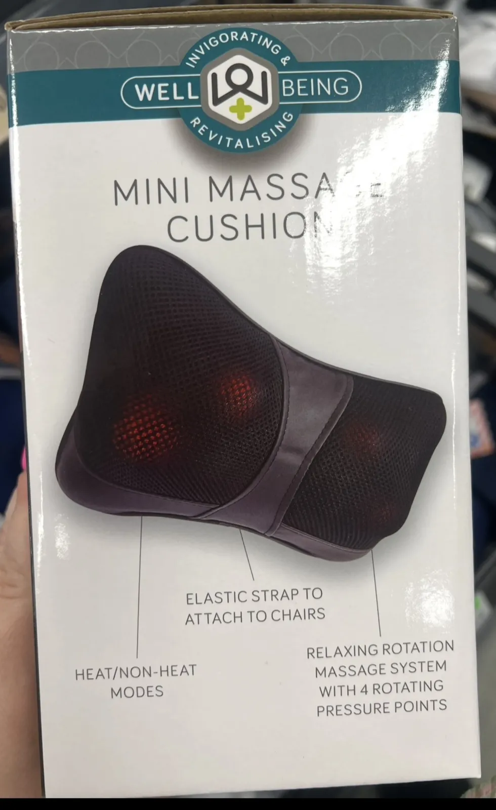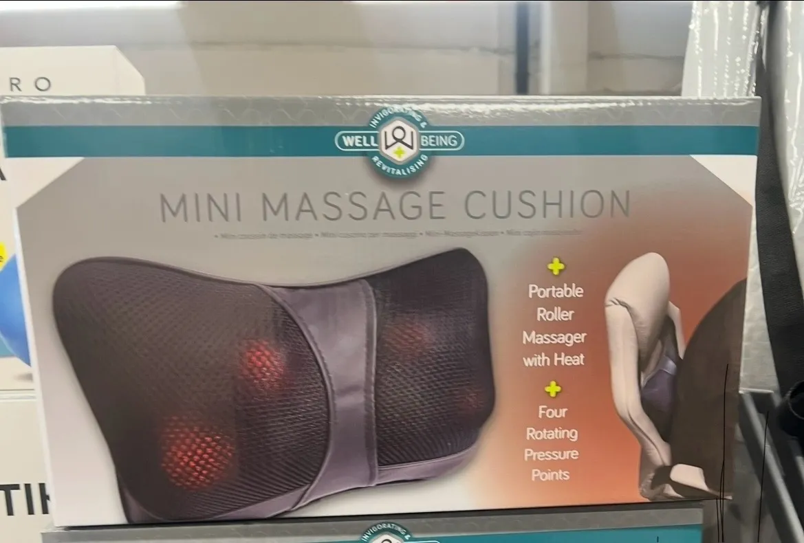 Masažinės pagalvėlės matmenys yra maždaug 10,5 cm x 28,5 cm x 9 cm, ji maitinama iš JK elektros tinklo (pridedamas adapteris)