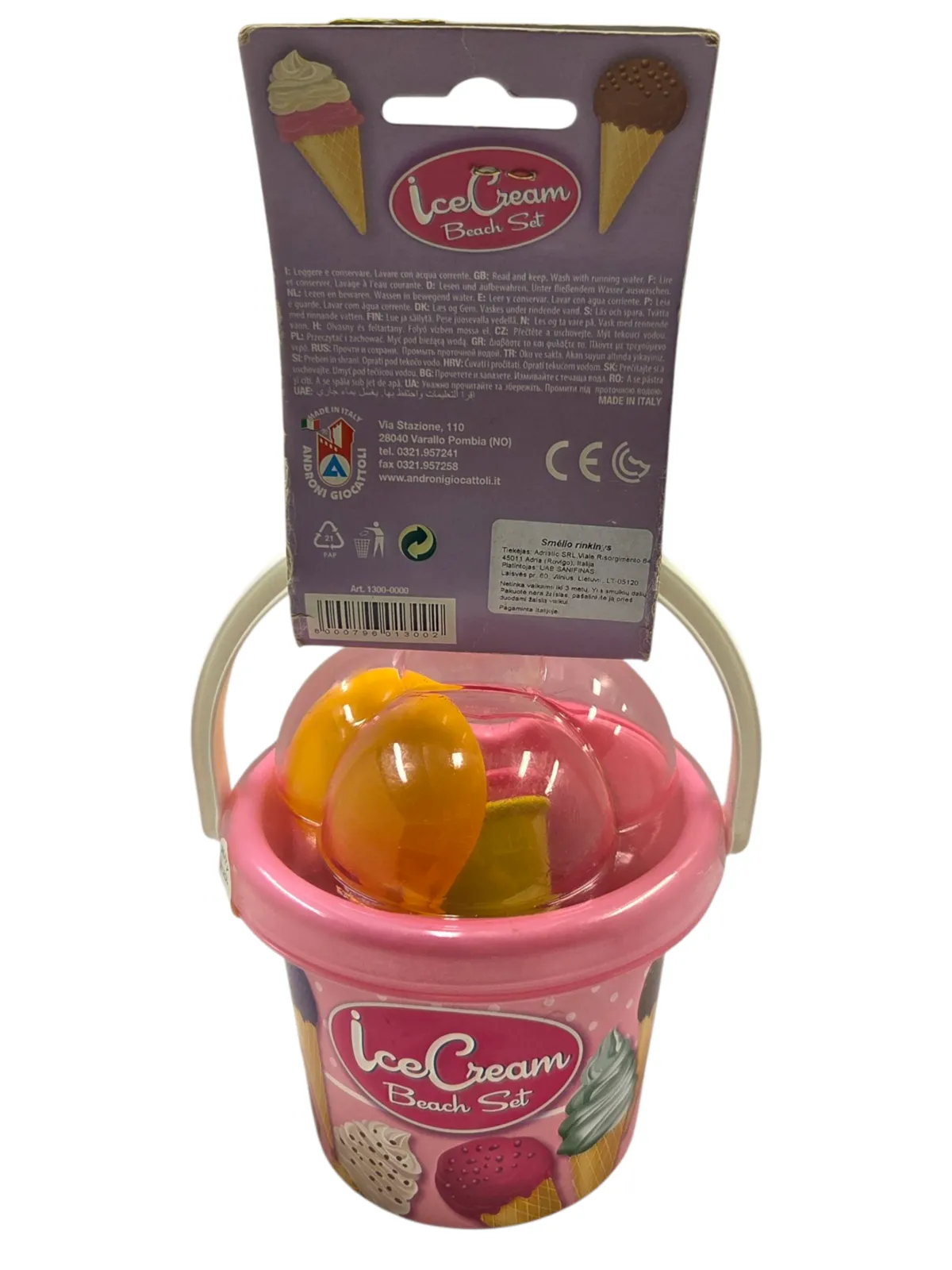 Rinkinyje: kibirėlis su rankena ir dangteliu, ledų porcijų šaukštas, ledų vaflis smėlio formoms daryti.