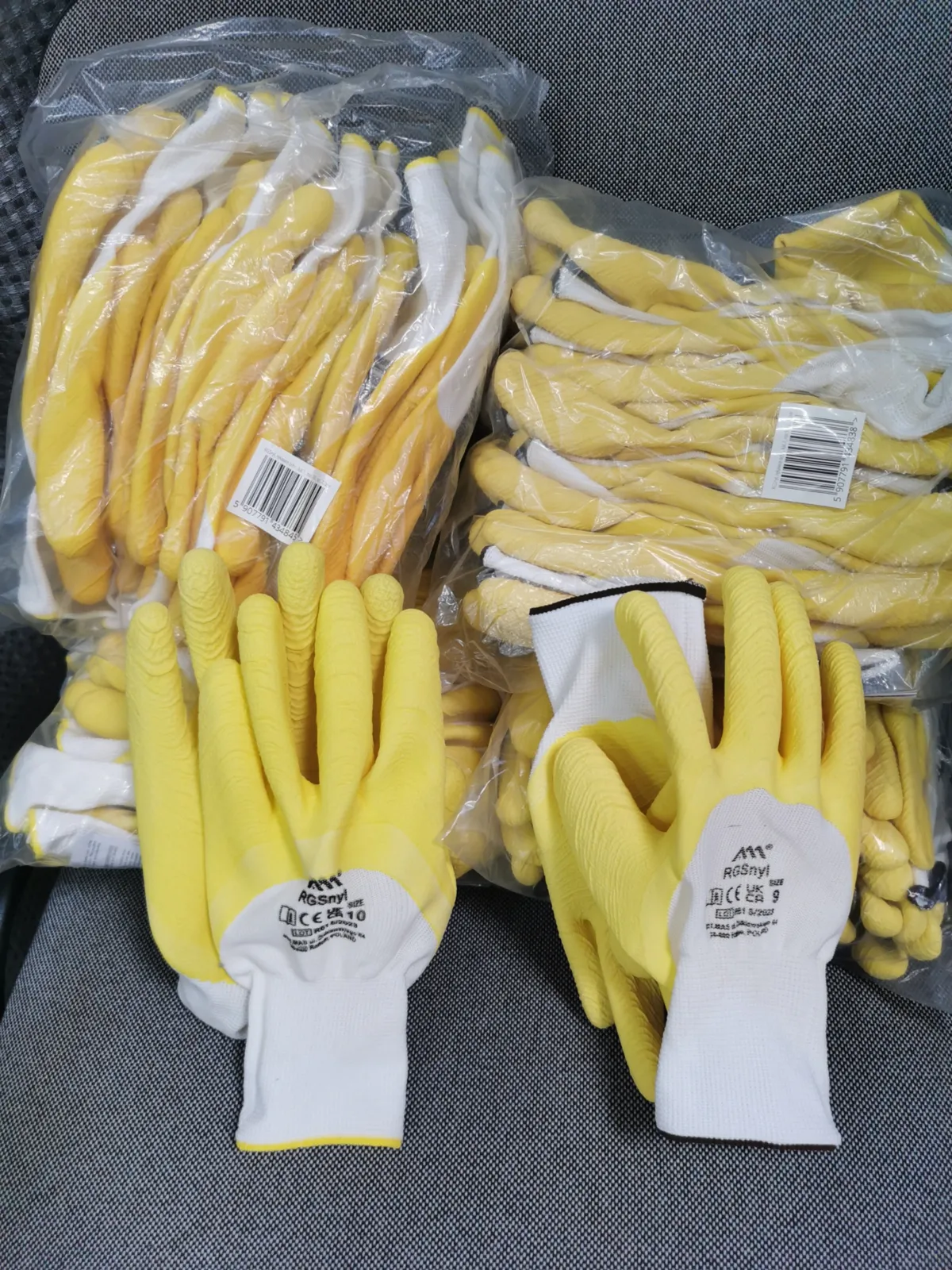 Apsauginės pirštinės, pagamintos iš poliesterio, padengtos geltonu lateksu,su megztais rankogaliais.